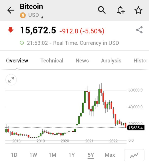 *BITCOIN FALLS 5% TO $15,600, LOWEST SINCE DECEMBER 2020