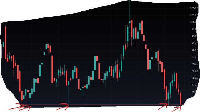 It's widely believed support fails after a double or triple major long-term bottom occurs. Comex Gold is a rare exception with 5 major weekly chart swing lows: 3/2021 5/2021 8/2021 7/2022 8/2022 all at 1,700. Right now we are on swing 5 at 1,707. It's unlikely support will hold.