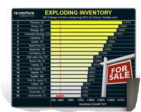 This news is a big negative for the real estate market! There's an incredible natiowide surge in U.S. housing inventory with Phoenix having the highest percentage increase of any city, up a staggering 177%. Source: re:venture consulting