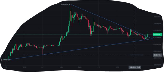 This "shiba inu" chart looks bullish and it appears there's a good possibility of a big upmove starting now (11-13-2021 9-PM NY time). Note how upsloping 45 degree & 18 degree angles converge with downsloping 32 degree angle and angles start at the important swing lows & highs.