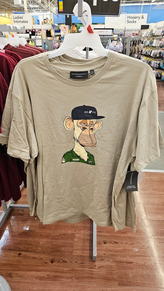 It would be interesting to know if the t-shirt maker simply right clicked that NFT and freely saved it, or paid someone for screen-print rights? It's highly unlikely a trademark, or buyer has any legal ownership rights because it's only a no-value html link and little more, with no real value.