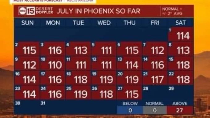 Last month was the hottest July ever recorded. Look at the amazing daily temps! Luckily the pool pool water was surprisingly comfortable all month. P.S. Last 4 days of mo not on chart were also above 110.