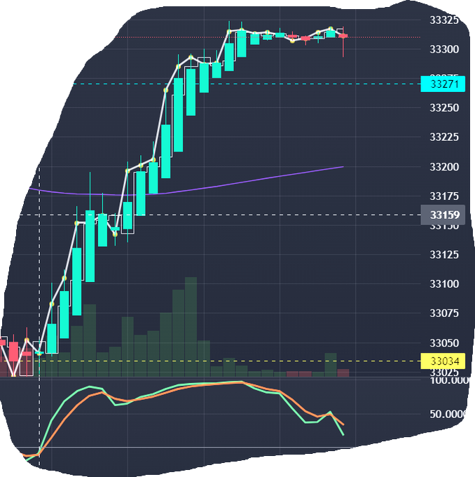We just realized how both strong (yet weak at same time) Micro Dow Jones futures looked this P.M. There was a rare 20 straight Heikin-Ashi 5-min green up-bars however bottom strength oscillator is not as strong, now going down with less strength and a negative near term outlook.