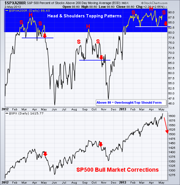 Stocks trading above the 200 day moving average is a great indicator for helping spot broad market underlying strength/weakness. It does lag the market but is still very powerful. The chart below shows this info and my thinking of what is likely to unfold sooner than later though price may still rise for several days yet.
