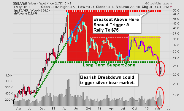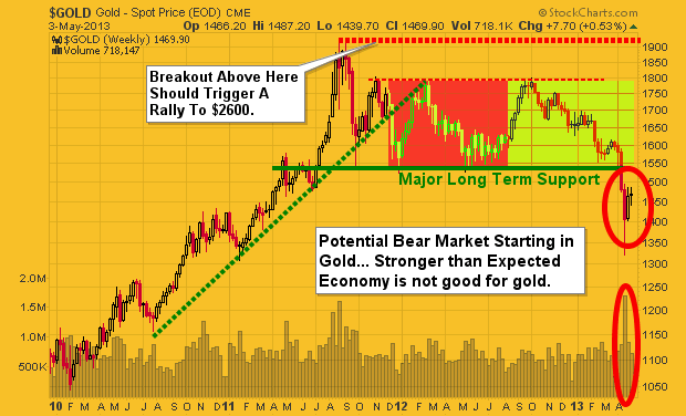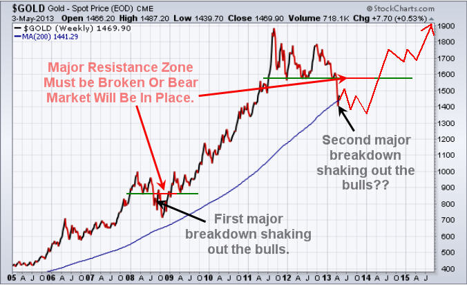 If you take a look at the chart below of gold you will notice that in 2008 we had a similar breakdown in price which purged the market of investors who where long gold. And if you compare the last two breakdowns they look very much the same. If price holds true then much higher prices are likely to unfold at the end of 2013.