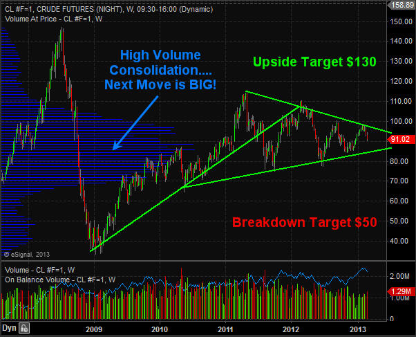 Oil had a huge bull market from 2009 until 2011 but since then has been trading sideways in a narrowing bullish range. I expect some big moves this year for oil and technical analysis puts the odds in favor for a higher price. If we do get a breakout and rally then $130 will likely be reached. But if price breaks down then a sharp drop to $50 per barrel looks like the next stop.