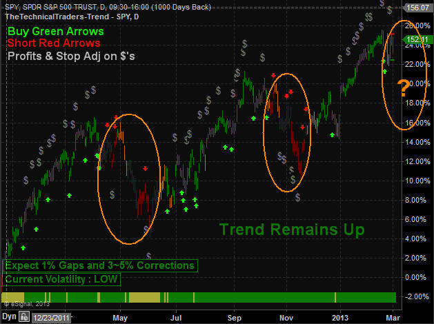 The SP500 continues to be in an up trend which I am trading with until price and volume tell me otherwise. But there are some early warning signs that another correction or a full blown bear market may be just around the corner (Sell-off in May??).
