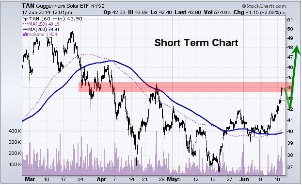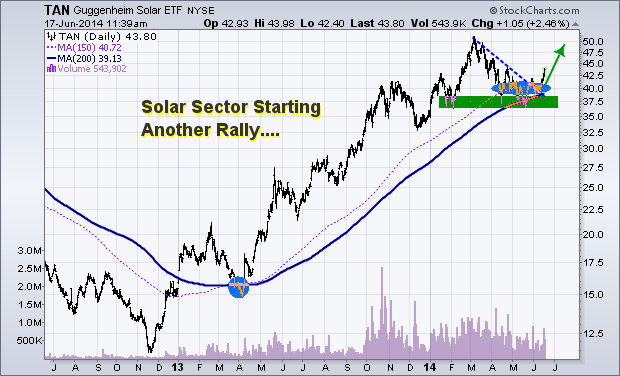 Today we are looking at the TAN solar ETF. This sector recently had a 23% hair cut in price. A 20-25% correction in price is a typical intermediate correction for a fast moving sector. The price correction has pulled the sector down to its 150 and 200 simple day moving averages. These levels tend to act as long term support for investors, a buying point.