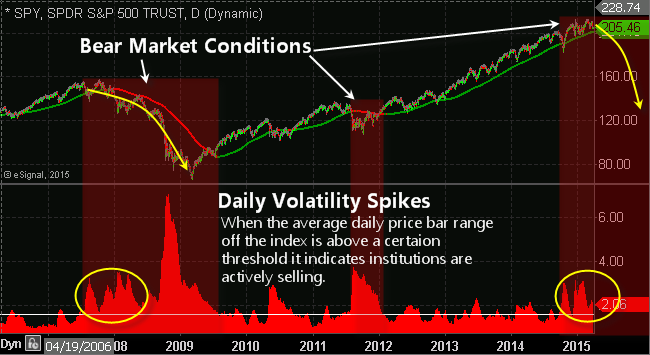 Also you will see the red ATR (Average True Range) indicator at the bottom. This tells us if the average daily movement for the index is high or low. When this red area rises we know there is a large amount of money flowing in and out of the equities market. It takes large amounts of capital to do this and is why the sellers are most likely hedge funds and institutions rebalancing their portfolios for an upcoming trend change.