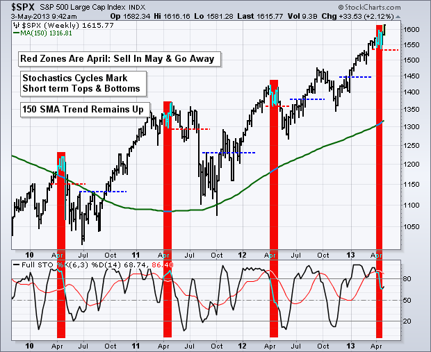 With May now upon us and historically prices fall more times than not I feel a 3-4 weeks correction is on the verge of starting. This Friday we just had very strong economic numbers confirming the economy is recovering. This news has sent stocks sharply higher as shorts cover their positions and investors who are not yet long get into position to profit from higher prices. But the herd psychology and their trades are typically incorrect as they invest based on fear and greed. The old saying is buy on negative news and sell on positive news will typically get you on the correct side of the market more times than not if used with price, volume and cycles.