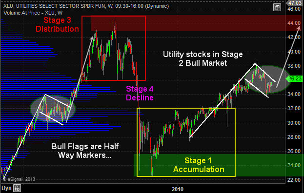 The utility sector has done well and continues to look very bullish for 2013. This high dividend paying sector is liked by many and the price action speaks for its self… If the overall financial market starts to peak then these sectors should hold up well because they are services, dividend and a commodity play wrapped in one.