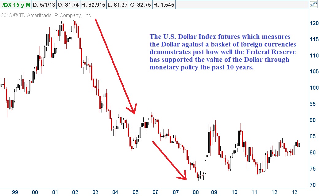 The Federal Reserve has two primary functions. One function is to maintain price stability or in other words to moderate inflation. Clearly over the past 100 years their inflation track record has been horrific. However, the Fed’s recent track record regarding the value of the U.S. Dollar Index has been dismal the past 15 years as shown below.