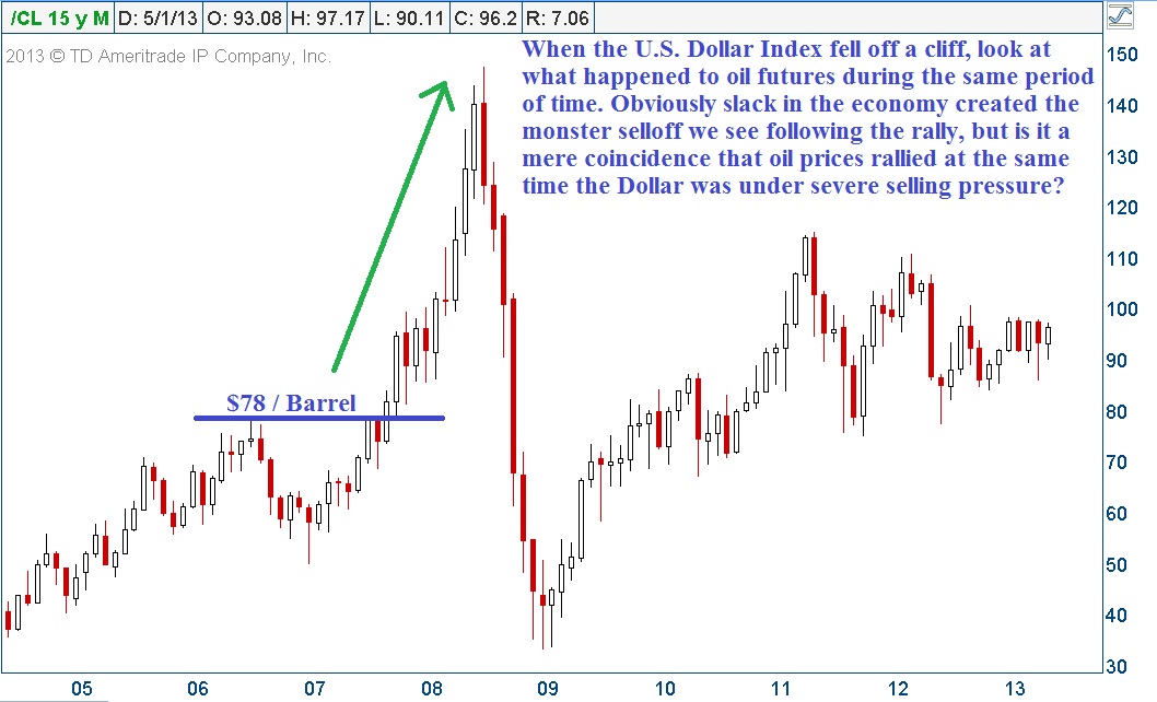 It is readily apparent that once oil futures were able to push above the $78 / barrel highs in mid- 2006, prices exploded while the U.S. Dollar came under strong selling pressure. The timing could not be more impeccable for the explosive nature in the move higher in oil.