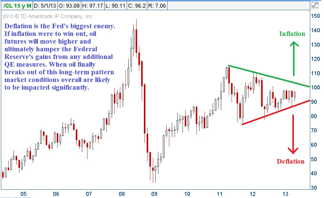 Furthermore, if we move forward to present day price action in oil futures we have a large triangle pattern on the long-term charts. The pattern offers the inflation versus deflation argument that so many economists and strategists are plagued by presently in their analysis.
